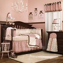 A dreamy arrangement of fabrics in a romantic color way with mauve cream and accents of brown creates a perfect nursery for your little princess. This Six Piece Crib Set includes a quilt bumper sheet dust ruffle diaper stacker and valance.